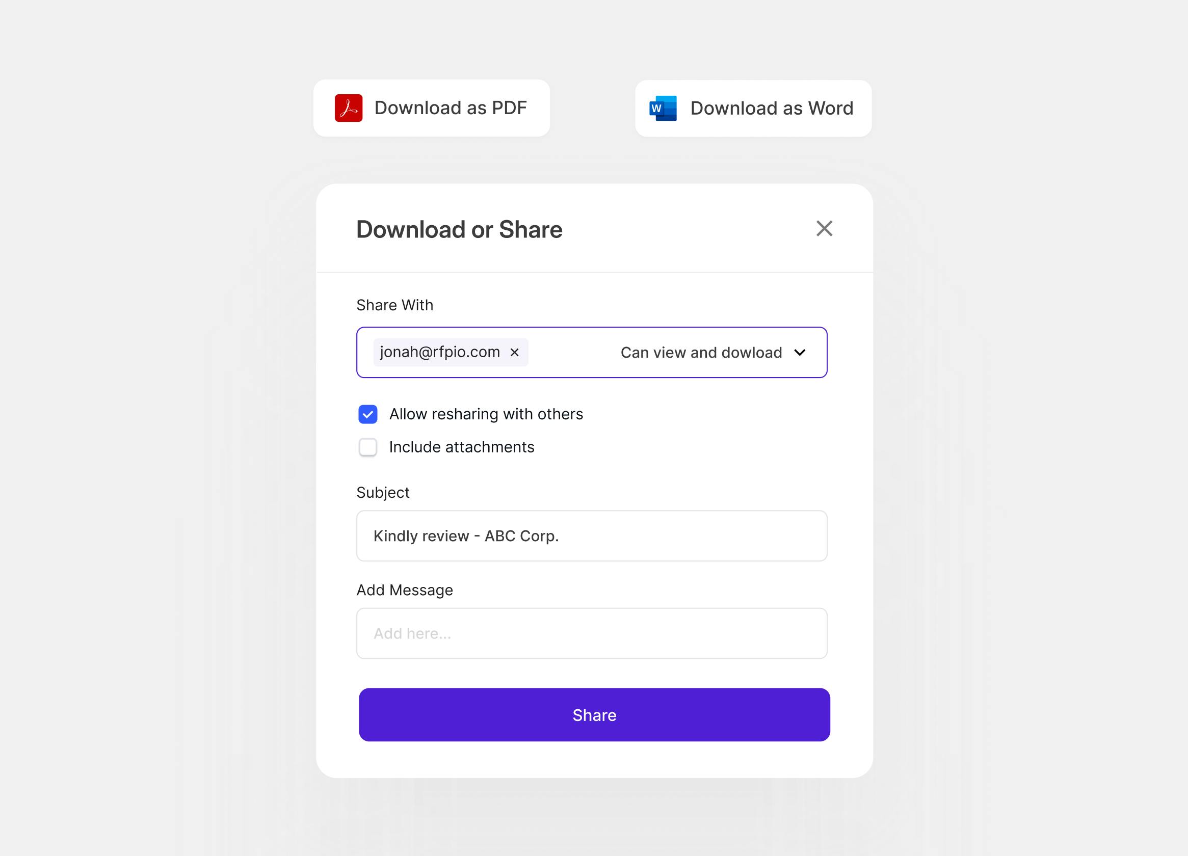 - Send proposals digitally through email directly from Proposal Builder or export them as Word or PDF documents